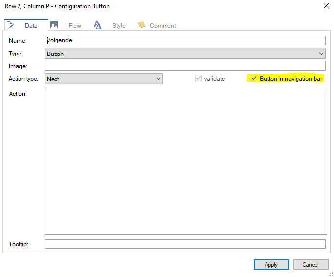 In versie 4.2.65 is een bug bekend dat bij de volgende knop de optie Button in navigation bar problemen geeft in het flow proces. Het formulier komt niet in de volgende stap. Door de optie uit te zetten. Dit betreft alleen bij de accordeon versie van tripleforms.