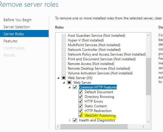Controleer of de webdav module aanstaat on de webserver (iis) Role..Deze mag niet aan staan op de server.
