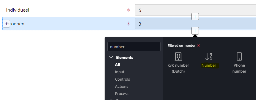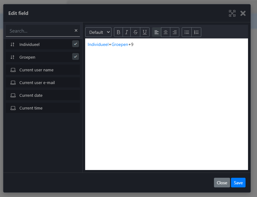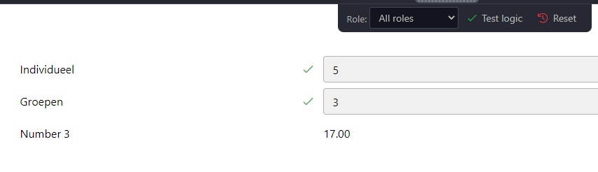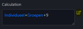 Vul de gewenste berekening en te gebruiken invoervelden in. Bijvoorbeeld Individueel+Groepen+9, waar individueel en groepen beide losse invoervelden zijn. De 9 is een zelf bedacht getal. Dit kun je zelf naar wens invoeren. 8*9 zou bijvoorbeeld ook kunnen. Of 5/Groepen (5 delen door de waarde die in veld Groepen is ingegeven).